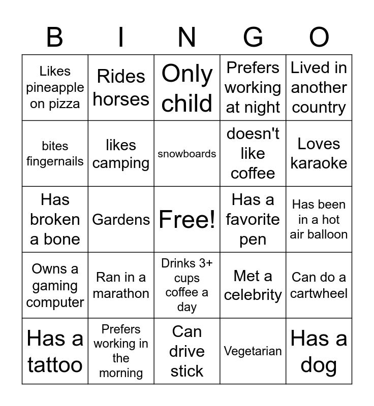 This bingo card has a free space and 45 words: Has a cat, Has a dog, Has an exotic pet, Has a tattoo, Is left-handed, Vegetarian, Only child, Twin or triplet, Lived in another country, Prefers working in the morning, Prefers working at night, Has a favorite pen, Drinks 3+ cups coffee a day, Ran in a marathon, Has taken a cruise, Can drive stick, Moved in the past year, Has broken a bone, Has been skydiving, Loves karaoke, Rides horses, Does Yoga, Loves roller coasters, Likes pineapple on pizza, Speaks 2+ languages, Has been in a hot air balloon, Going on vacation soon, Plays an instrument, Met a celebrity, Owns a gaming computer, Knows how to surf, Can do a cartwheel, Knows martial arts, Has been to the Olympics, celebrating a birthday this month, Gardens, in a sports league, oldest sibling, youngest sibling, snowboards, bites fingernails, doesn't like coffee, doesn't like chocolate, likes camping and scared of spiders.