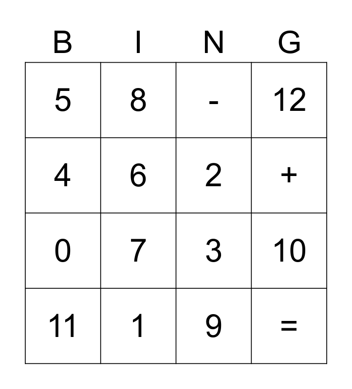This bingo card has 16 words: 1, 10, -, 5, 0, 8, 3, 9, 4, 6, 11, 12, 7, +, 2 and =.