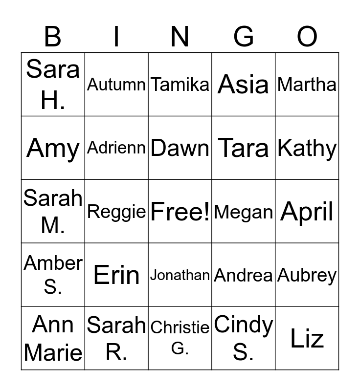This bingo card has a free space and 25 words: Erin, Christie G., Dawn, Ann Marie, Martha, Sara H., Amy, Autumn, Megan, Jonathan, Tara, Sarah M., Andrea, Aubrey, Adrienn, Tiffany, April, Tamika, Kathy, Reggie, Liz, Sarah R., Amber S., Asia and Cindy S..