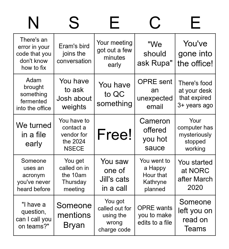 This bingo card has a free space and 24 words: You get called on in the 10am Thursday meeting, Someone mentions Bryan, You have to QC something, "I have a question, can I call you on teams?", You've gone into the office!, There's an error in your code that you don't know how to fix, Adam brought something fermented into the office, Eram's bird joins the conversation, Cameron offered you hot sauce, You saw one of Jill's cats in a call, OPRE sent an unexpected email, We turned in a file early, You went to a Happy Hour that Kathryne planned, You started at NORC after March 2020, You have to ask Josh about weights, OPRE wants you to make edits to a file, Your computer has mysteriously stopped working, Your meeting got out a few minutes early, There's food at your desk that expired 3+ years ago, You have to contact a vendor for the 2024 NSECE, Someone left you on read on Teams, Someone uses an acronym you've never heard before, "We should ask Rupa" and You got called out for using the wrong charge code.