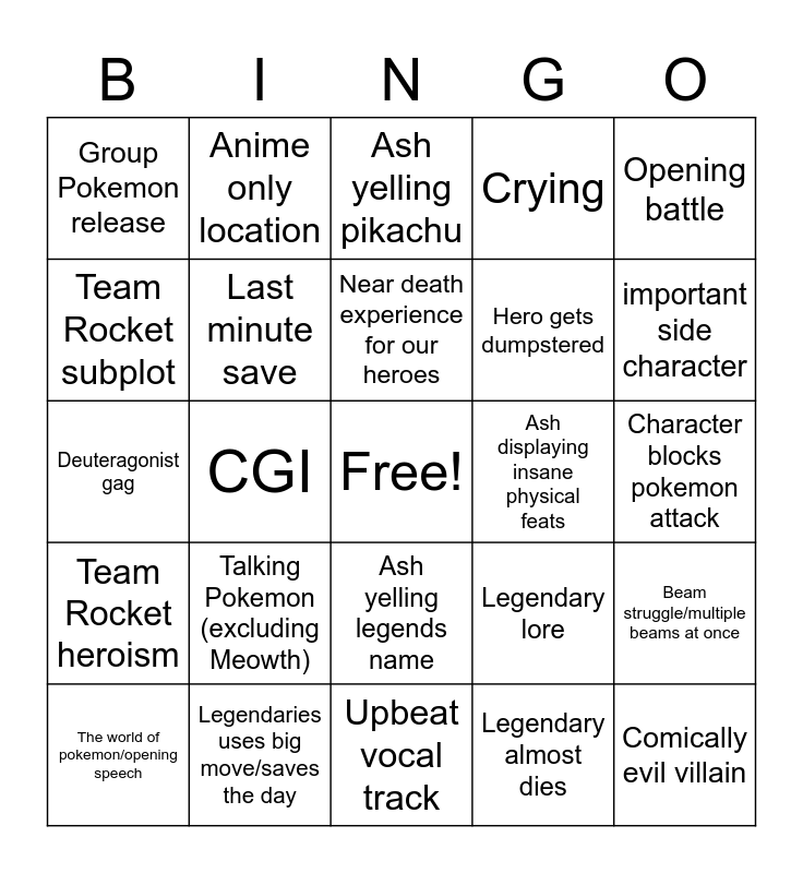 This bingo card has a free space and 24 words: Talking Pokemon (excluding Meowth), Legendaries uses big move/saves the day, Near death experience for our heroes, The world of pokemon/opening speech, Opening battle, Group Pokemon release, Team Rocket subplot, Anime only location, Ash displaying insane physical feats, Ash yelling legends name, Hero gets dumpstered, Deuteragonist gag, Legendary lore, Beam struggle/multiple beams at once, Last minute save, Legendary almost dies, Character blocks pokemon attack, Ash yelling pikachu, important side character, CGI, Comically evil villain, Team Rocket heroism, Crying and Upbeat vocal track.