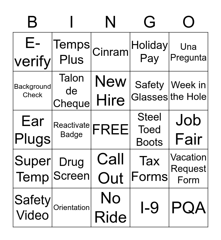 This bingo card has a free space and 24 words: Drug Screen, Orientation, New Hire, Safety Video, Una Pregunta, E-verify, Background Check, Temps Plus, Steel Toed Boots, Call Out, Safety Glasses, Ear Plugs, Tax Forms, Vacation Request Form, Talon de Cheque, I-9, Job Fair, Cinram, Week in the Hole, Reactivate Badge, PQA, Super Temp, Holiday Pay and No Ride.