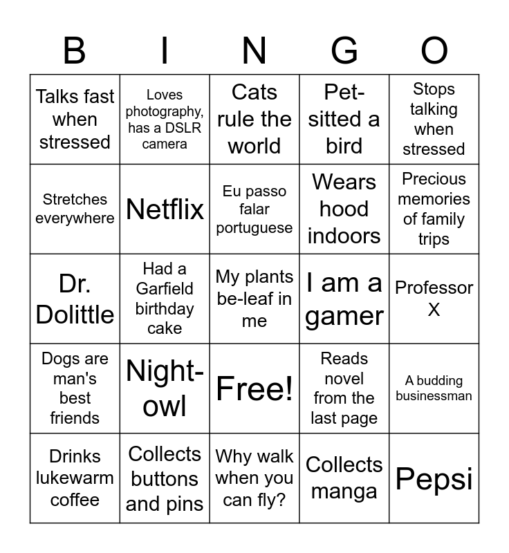 This bingo card has 26 words: Free!, Collects manga, Eu passo falar portuguese, Collects buttons and pins, Stops talking when stressed, Talks fast when stressed, Stretches everywhere, Loves photography, has a DSLR camera, Professor X, Reads novel from the last page, Wears hood indoors, Dr. Dolittle, A budding businessman, Drinks lukewarm coffee, Had a Garfield birthday cake, The last waterbender, Pet-sitted a bird, Dogs are man's best friends, Cats rule the world, My plants be-leaf in me, Precious memories of family trips, Why walk when you can fly?, I am a gamer, Night-owl, Netflix and Pepsi.