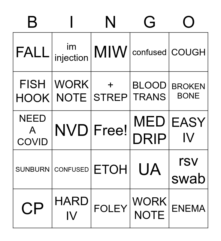 This bingo card has a free space and 29 words: CP, NTG, NVD, MVC, FALL, MIW, WORK NOTE, CONFUSED, MED DRIP, HARD IV, EASY IV, ENEMA, FOLEY, WORK NOTE, BROKEN BONE, GET OUT OF JAIL, ETOH, SUNBURN, COUGH, NEED A COVID, UA, STREP Swab, BLOOD TRANS, FISH HOOK, confused, im injection, rsv swab, + STREP and + COVID.