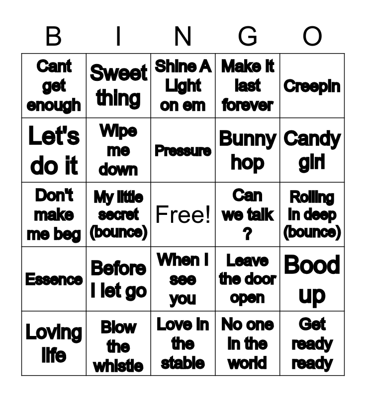 This bingo card has a free space and 24 words: Before I let go, Blow the whistle, Pressure, Loving life, Creepin, Cant get enough, Let's do it, Sweet thing, Can we talk ?, When I see you, Bunny hop, Don't make me beg, Leave the door open, Bood up, Wipe me down, No one in the world, Rolling In deep (bounce), Shine A Light on em, Candy girl, My little secret (bounce), Get ready ready, Essence, Make it last forever and Love in the stable.