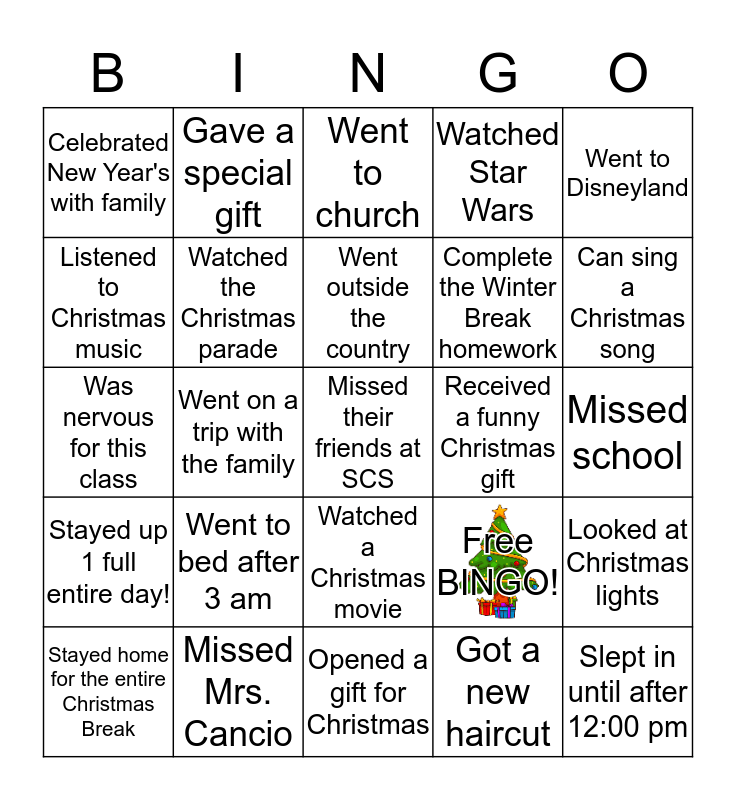 This bingo card has 1 images and 25 words: Went to bed after 3 am, Opened a gift for Christmas, Went outside the country, Stayed home for the entire Christmas Break, Went to Disneyland, Celebrated New Year's with family, Listened to Christmas music, Gave a special gift, Received a funny Christmas gift, Watched a Christmas movie, Complete the Winter Break homework, Was nervous for this class, Free BINGO!, Looked at Christmas lights, Watched the Christmas parade, Slept in until after 12:00 pm, Missed school, Went to church, Can sing a Christmas song, Went on a trip with the family, Missed their friends at SCS, Missed Mrs. Cancio, Stayed up 1 full entire day!, Watched Star Wars and Got a new haircut.