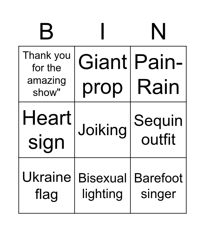 This bingo card has 15 words: Nu kör vi!, Higher-Fire, Pain-Rain, Thank you for the amazing show", Bisexual lighting, Joiking, Light sticks, Same songwriters of a previous song, Sequin outfit, Barefoot singer, Key change, Heart sign, Ukraine flag, Giant prop and Wind machine.