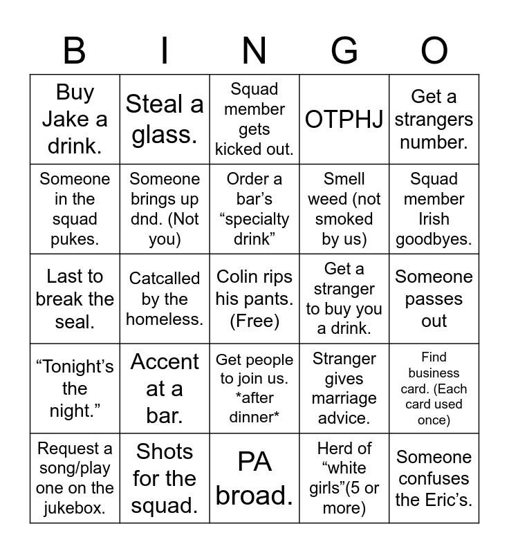 This bingo card has a free space and 24 words: Accent at a bar., Shots for the squad., Order a bar’s “specialty drink”, Request a song/play one on the jukebox., Get a strangers number., Buy Jake a drink., Someone in the squad pukes., Steal a glass., Get a stranger to buy you a drink., Get people to join us. *after dinner*, Smell weed (not smoked by us), Last to break the seal., Stranger gives marriage advice., Find business card. (Each card used once), Someone brings up dnd. (Not you), Herd of “white girls”(5 or more), Someone passes out, Squad member gets kicked out., Squad member Irish goodbyes., Catcalled by the homeless., Someone confuses the Eric’s., “Tonight’s the night.”, OTPHJ and PA broad..