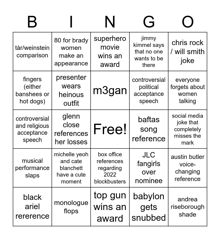 This bingo card has a free space and 24 words: michelle yeoh and cate blanchett have a cute moment, monologue flops, m3gan, black ariel rererence, chris rock / will smith joke, tàr/weinstein comparison, fingers (either banshees or hot dogs), 80 for brady women make an appearance, baftas song reference, box office references regarding 2022 blockbusters, controversial political acceptance speech, controversial and religious acceptance speech, JLC fangirls over nominee, austin butler voice-changing reference, presenter wears heinous outfit, babylon gets snubbed, social media joke that completely misses the mark, superhero movie wins an award, everyone forgets about women talking, glenn close references her losses, andrea riseborough shade, musical performance slaps, jimmy kimmel says that no one wants to be there and top gun wins an award.
