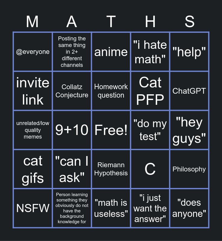 This bingo card has 1 images, a free space and 38 words: 1+1, 12/3(2+2), Collatz Conjecture, NSFW, Riemann Hypothesis, Homework question, "I bet no one can do this", "help", cat gifs, 9+10, "i hate math", "does anyone", "hey guys", "do my test", "can I ask", weird gifs, @everyone, X-phobia, C, invite link, "math is useless", Cat PFP, ChatGPT, Underage user, JEE, SAT, Makes fun of non-math majors, L'Hopital Ban, Posting the same thing in 2+ different channels, Animal noises (woof, meow, etc.), "hi", anime, Person learning something they obviously do not have the background knowledge for, "i just want the answer", Religion, Philosophy, unrelated/low quality memes and @moderators.