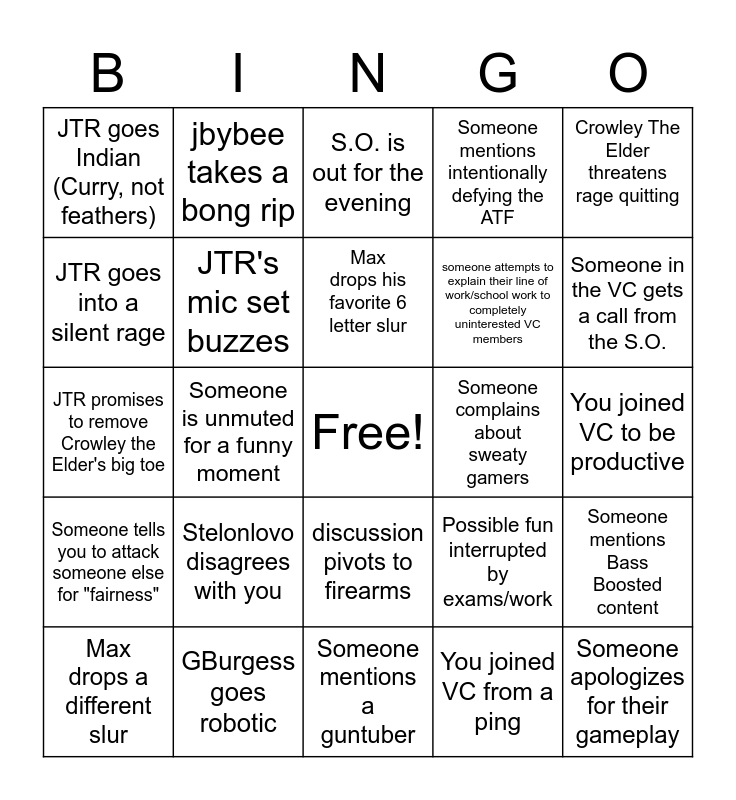 This bingo card has a free space and 24 words: Stelonlovo disagrees with you, GBurgess goes robotic, Max drops his favorite 6 letter slur, Max drops a different slur, Crowley The Elder threatens rage quitting, JTR goes Indian (Curry, not feathers), JTR goes into a silent rage, jbybee takes a bong rip, Someone complains about sweaty gamers, discussion pivots to firearms, someone attempts to explain their line of work/school work to completely uninterested VC members, JTR promises to remove Crowley the Elder's big toe, Possible fun interrupted by exams/work, Someone mentions Bass Boosted content, JTR's mic set buzzes, You joined VC from a ping, You joined VC to be productive, S.O. is out for the evening, Someone in the VC gets a call from the S.O., Someone is unmuted for a funny moment, Someone apologizes for their gameplay, Someone tells you to attack someone else for "fairness", Someone mentions intentionally defying the ATF and Someone mentions a guntuber.