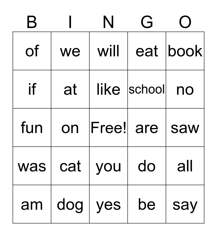 This bingo card has a free space and 24 words: cat, dog, like, am, book, of, if, we, are, you, school, fun, do, all, at, be, saw, will, no, on, say, was, eat and yes.