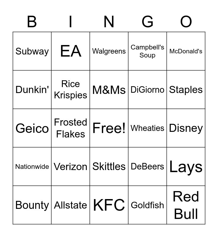 This bingo card has a free space and 40 words: Kay Jewelers, Geico, Nike, Rice Krispies, Allstate, Skittles, M&Ms, Maybelline, McDonald's, Nationwide, Frosted Flakes, Campbell's Soup, Red Bull, Disney, Wheaties, Verizon, Meow Mix, Subway, Fed Ex, Walgreens, Lays, Goldfish, DiGiorno, Dunkin', Lucky Charms, Capital One, Energizer, Maxwell House, Morton Salt, Gillette, L'Oreal, Bounty, Mazda, DeBeers, Staples, KFC, Apple, Burger King, EA and State Farm.