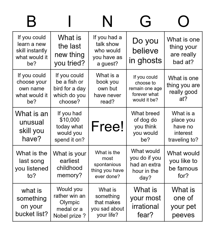 This bingo card has a free space and 24 words: What is your earliest childhood memory?, Would you rather win an Olympic medal or a Nobel prize ?, What is a book you own but have never read?, what is something on your bucket list?, What is one thing your are really bad at?, If you could learn a new skill instantly what would it be?, If you could choose your own name what would it be?, What is the last new thing you tried?, What breed of dog do you think you would be?, What is the most spontanious thing you have ever done?, If you could choose to remain one age forever what would it be?, What is an unusual skill you have?, What would you do if you had an extra hour in the day?, What would you like to be famous for?, If you could be a fish or bird for a day which do you choose?, What is your most irrational fear?, What is a place you have no interest traveling to?, If you had a talk show who would you have as a guest?, What is one thing you are really good at?, If you had $10,000 today what would you spend it on?, What is one of your pet peeves, What is the last song you listened to?, Do you believe in ghosts and What is something that makes you sad about your life?.