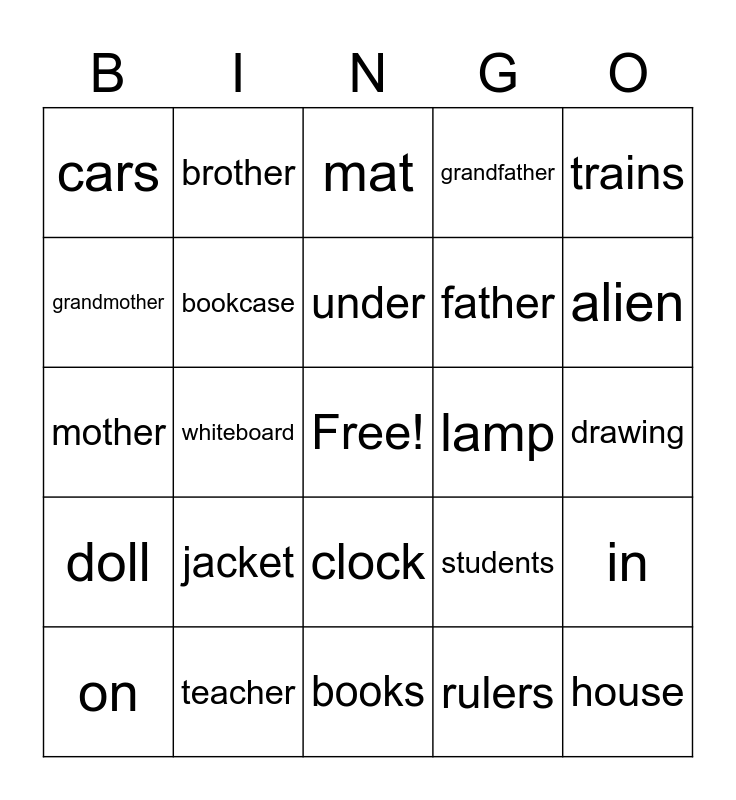 This bingo card has a free space and 30 words: teacher, cupboards, whiteboard, sofa, cars, mat, bookcase, clock, lamp, books, drawing, house, rulers, cameras, alien, computer game, students, doll, jacket, trains, mother, sister, brother, father, grandmother, grandfather, in, on, under and next to.