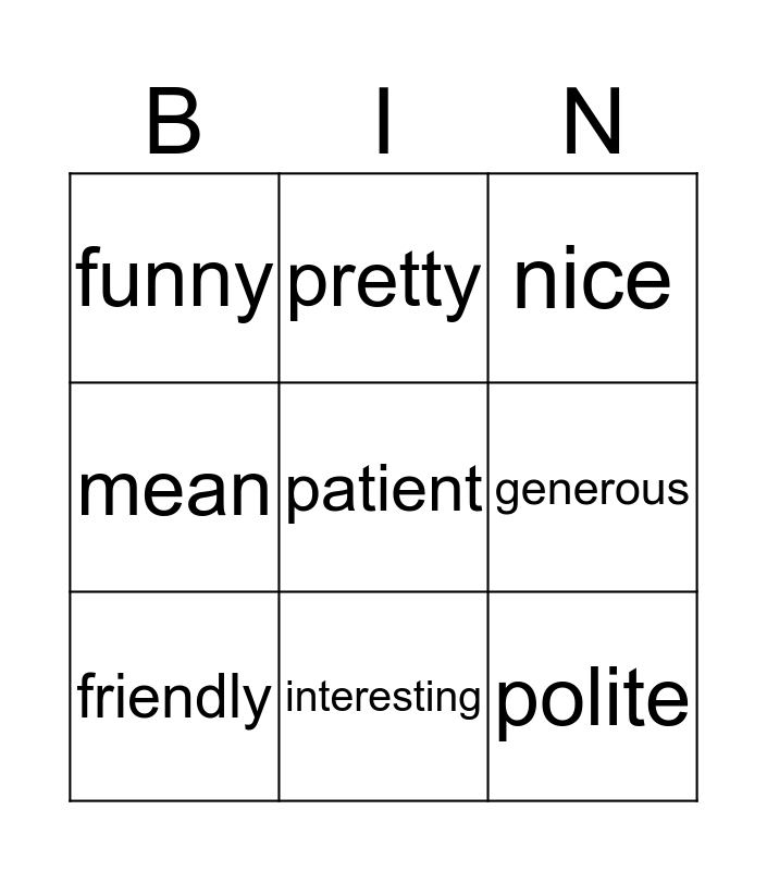 This bingo card has 9 words: friendly, nice, pretty, mean, funny, generous, patient, polite and interesting.