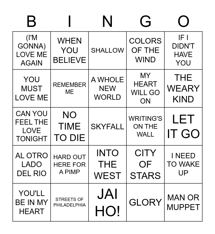This bingo card has 31 words: JAI HO!, LOSE YOURSELF, NO TIME TO DIE, FIGHT FOR YOU, (I'M GONNA) LOVE ME AGAIN, SHALLOW, REMEMBER ME, CITY OF STARS, WRITING'S ON THE WALL, GLORY, LET IT GO, SKYFALL, MAN OR MUPPET, WE BELONG TOGETHER, THE WEARY KIND, FALLING SLOWLY, I NEED TO WAKE UP, HARD OUT HERE FOR A PIMP, AL OTRO LADO DEL RIO, INTO THE WEST, IF I DIDN'T HAVE YOU, THINGS HAVE CHANGED, YOU'LL BE IN MY HEART, WHEN YOU BELIEVE, MY HEART WILL GO ON, YOU MUST LOVE ME, COLORS OF THE WIND, CAN YOU FEEL THE LOVE TONIGHT, STREETS OF PHILADELPHIA, A WHOLE NEW WORLD and BEAUTY AND THE BEAST.