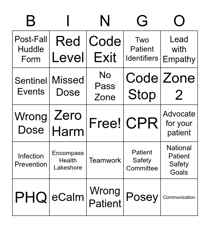 This bingo card has a free space and 25 words: PHQ, Encompass Health Lakeshore, No Pass Zone, Posey, Zone 2, Post-Fall Huddle Form, Red Level, Code Exit, Code Stop, National Patient Safety Goals, Wrong Dose, Missed Dose, Patient Safety Committee, Communication, Sentinel Events, eCalm, Wrong Patient, Two Patient Identifiers, Advocate for your patient, Infection Prevention, Zero Harm, Teamwork, CPR, Lead with Empathy and Do What's Right.