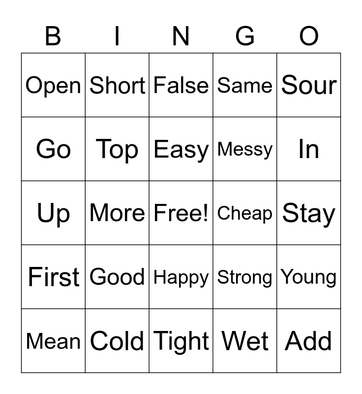 This bingo card has a free space and 24 words: Good, Cold, Easy, Mean, Sour, Open, Go, Short, Cheap, Happy, Messy, Up, Strong, Young, Top, Wet, Stay, False, In, More, Add, First, Same and Tight.