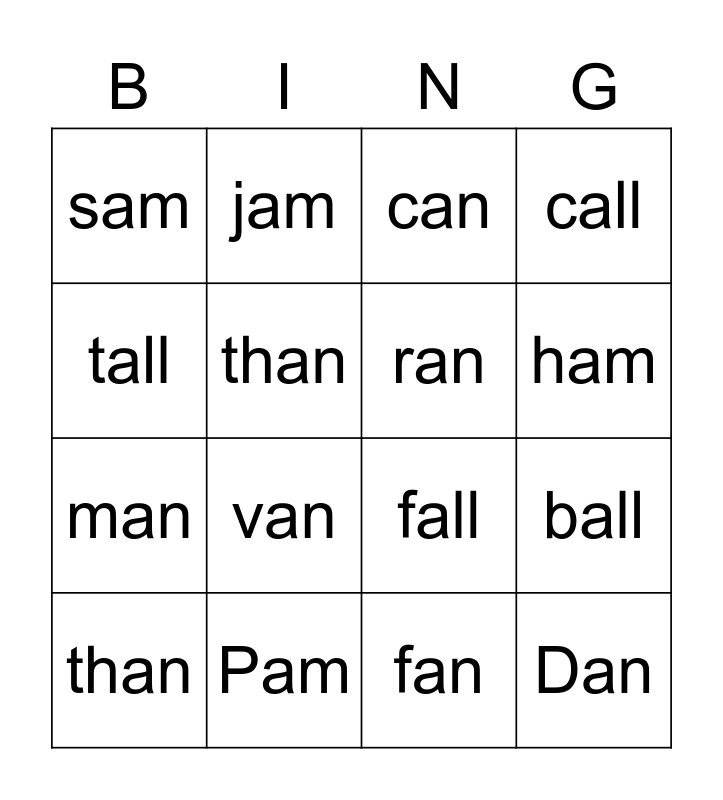 This bingo card has 21 words: Pam, pan, jam, tan, fan, ran, sam, can, fall, ham, man, call, Dan, wall, than, mall, than, van, tall, ball and fall.