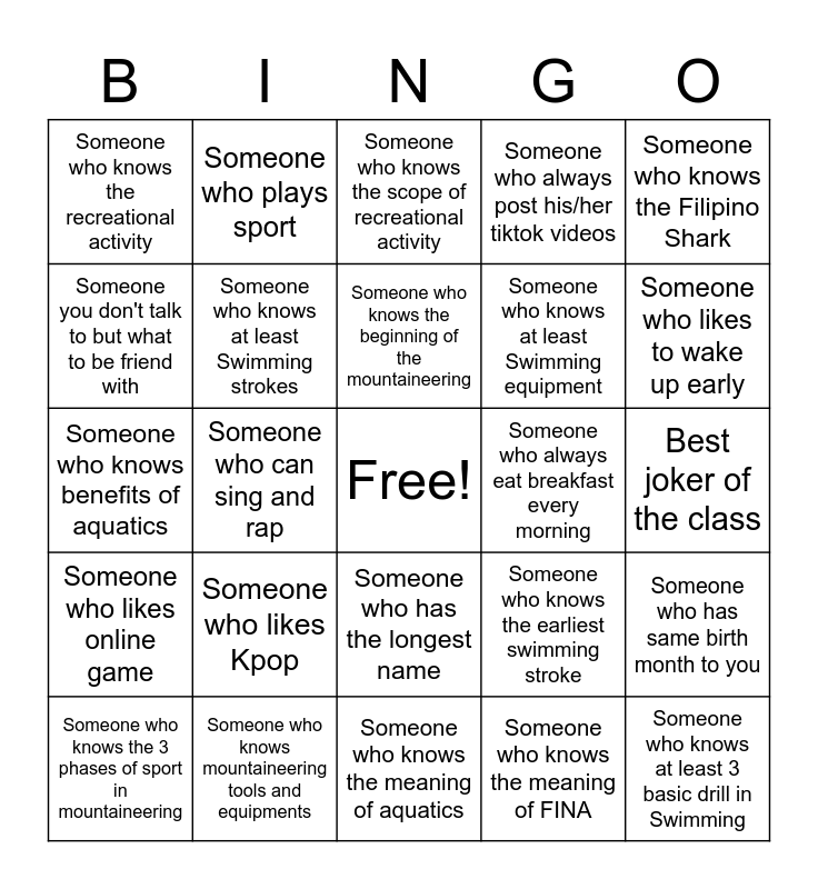 This bingo card has a free space and 24 words: Someone who likes Kpop, Someone who knows mountaineering tools and equipments, Someone who knows the beginning of the mountaineering, Someone who knows the 3 phases of sport in mountaineering, Someone who knows the Filipino Shark, Someone who knows the recreational activity, Someone you don't talk to but what to be friend with, Someone who plays sport, Someone who always eat breakfast every morning, Someone who has the longest name, Someone who knows at least Swimming equipment, Someone who knows benefits of aquatics, Someone who knows the earliest swimming stroke, Someone who has same birth month to you, Someone who knows at least Swimming strokes, Someone who knows the meaning of FINA, Best joker of the class, Someone who knows the scope of recreational activity, Someone who likes to wake up early, Someone who can sing and rap, Someone who knows at least 3 basic drill in Swimming, Someone who likes online game, Someone who always post his/her tiktok videos and Someone who knows the meaning of aquatics.