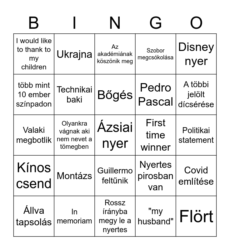 This bingo card has a free space and 24 words: Montázs, In memoriam, Bőgés, Állva tapsolás, Disney nyer, I would like to thank to my children, több mint 10 ember színpadon, Ukrajna, First time winner, Guillermo feltűnik, Pedro Pascal, Valaki megbotlik, Nyertes pirosban van, Covid említése, Technikai baki, "my husband", Politikai statement, Az akadémiának köszönik meg, A többi jelölt dícsérése, Olyankra vágnak aki nem nevet a tömegben, Flört, Kínos csend, Szobor megcsókolása and Rossz írányba megy le a nyertes.