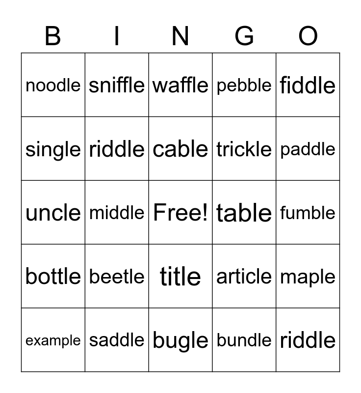 This bingo card has a free space and 25 words: beetle, bugle, cable, example, fiddle, noodle, single, sniffle, table, title, trickle, uncle, article, maple, riddle, stumble, fumble, waffle, paddle, middle, riddle, saddle, bottle, pebble and bundle.