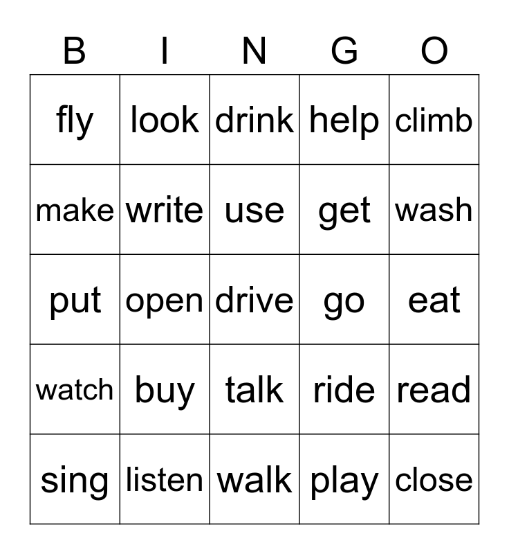 This bingo card has a free space and 24 words: buy, listen, use, sing, climb, fly, make, look, go, talk, get, put, ride, read, write, play, eat, drink, wash, open, close, watch, help and walk.