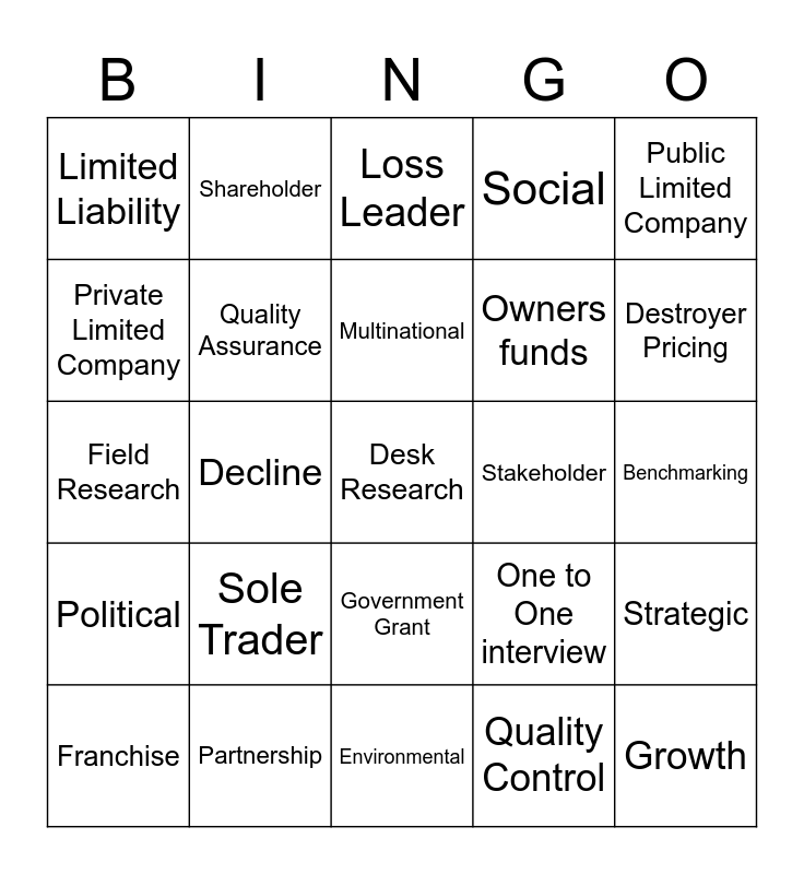 This bingo card has a free space and 24 words: Sole Trader, Partnership, Multinational, Franchise, Public Limited Company, Limited Liability, Private Limited Company, Shareholder, Stakeholder, Government Grant, Owners funds, Field Research, One to One interview, Strategic, Quality Assurance, Quality Control, Benchmarking, Loss Leader, Destroyer Pricing, Decline, Growth, Political, Social and Environmental.