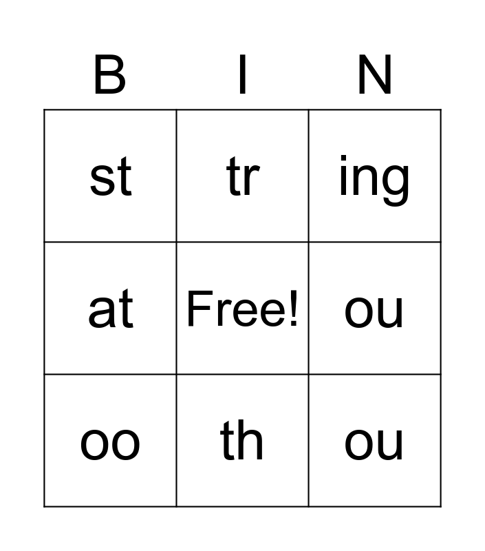 This bingo card has a free space and 8 words: ou, ing, tr, oo, st, ou, at and th.