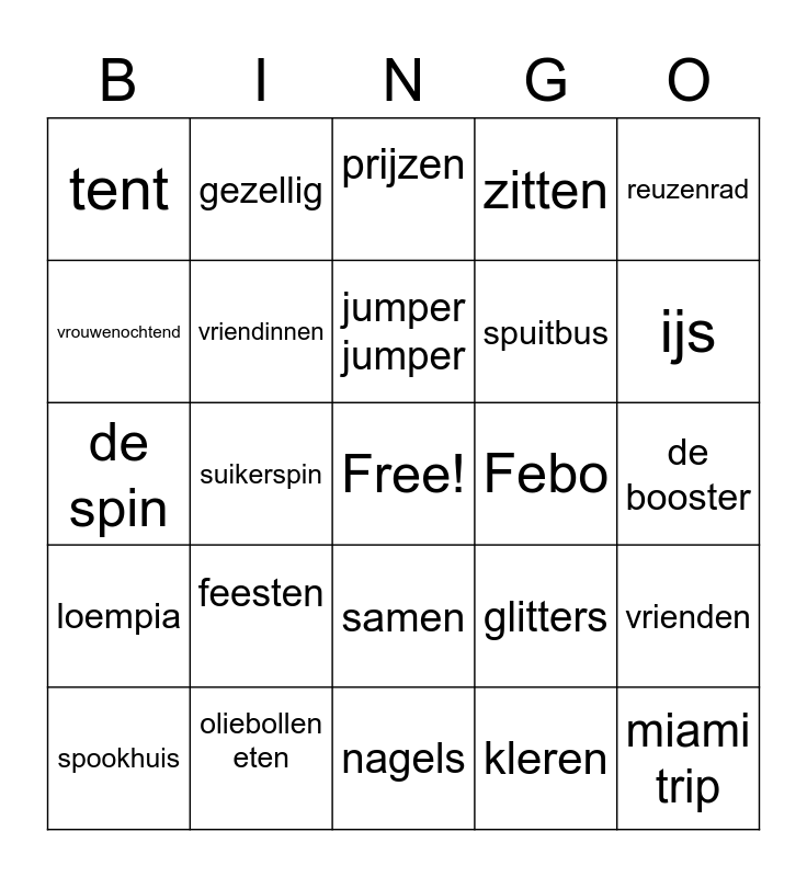 This bingo card has a free space and 24 words: feesten, oliebollen eten, jumper jumper, spookhuis, reuzenrad, tent, vrouwenochtend, gezellig, Febo, samen, spuitbus, de spin, glitters, vrienden, vriendinnen, kleren, de booster, prijzen, ijs, suikerspin, miami trip, loempia, zitten and nagels.