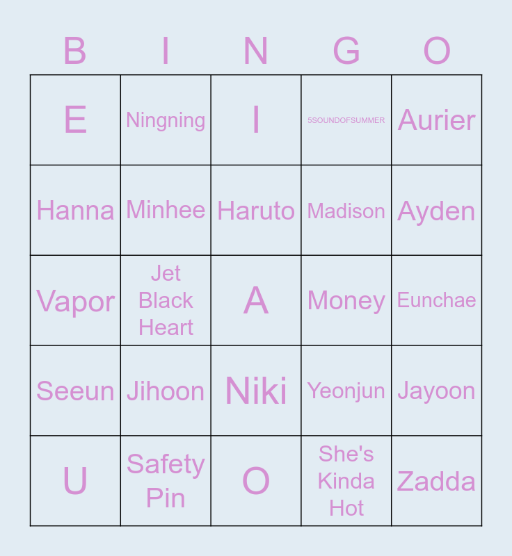 This bingo card has a free space and 24 words: Jihoon, Safety Pin, Haruto, U, Aurier, E, Hanna, Ningning, Money, Niki, Madison, Vapor, Yeonjun, Jayoon, Minhee, She's Kinda Hot, Eunchae, I, Ayden, Jet Black Heart, Zadda, Seeun, 5SOUNDOFSUMMER and O.