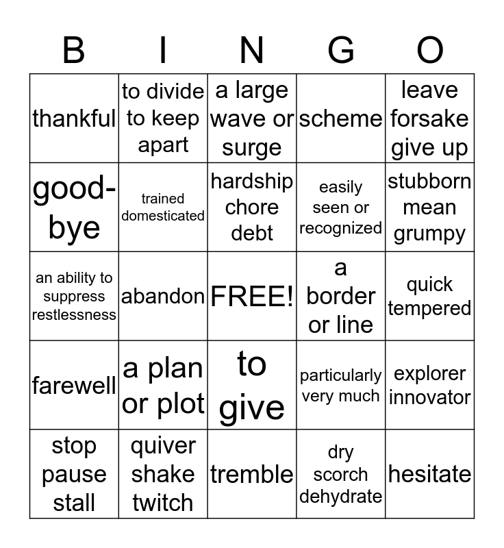 This bingo card has a free space and 24 words: a plan or plot, quiver shake twitch, hardship chore debt, stop pause stall, leave forsake give up, thankful, good-bye, to divide to keep apart, a border or line, to give, easily seen or recognized, an ability to suppress restlessness, particularly very much, explorer innovator, trained domesticated, dry scorch dehydrate, quick tempered, a large wave or surge, stubborn mean grumpy, abandon, hesitate, farewell, scheme and tremble.