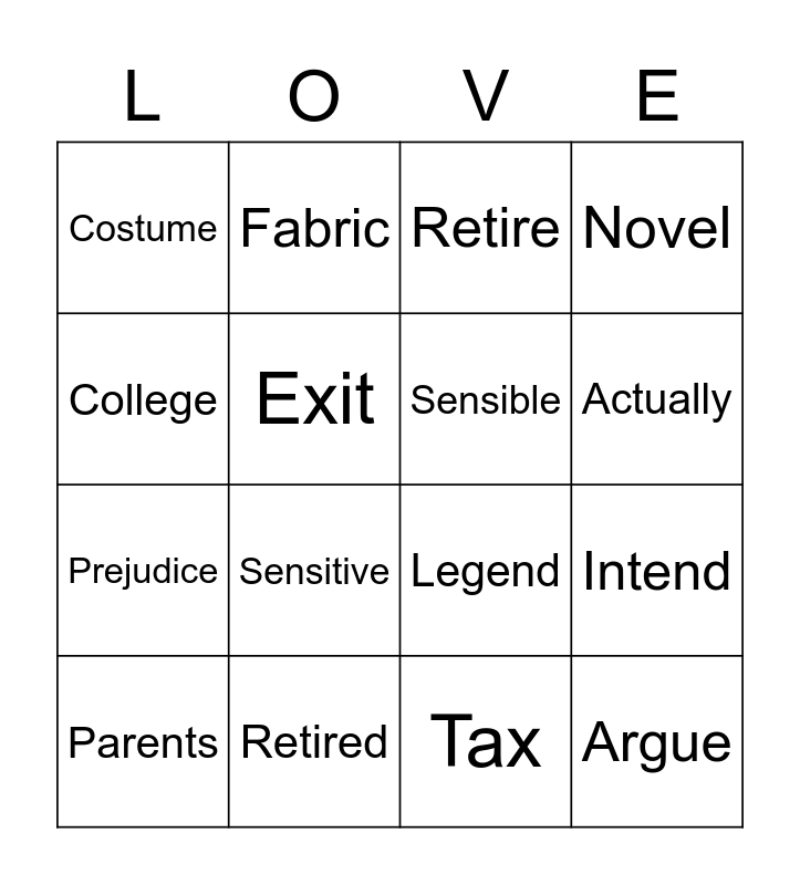 This bingo card has 26 words: Free!, Library, Actually, Argument, College, Costume, Exit, Fabric, Tax, Realize, Prejudice, Legend, Cigar, Collar, Intend, Large, Novel, Argue, Retire, Parents, Sensitive, Push, Retired, Exquisite, Sensible and Pretend.