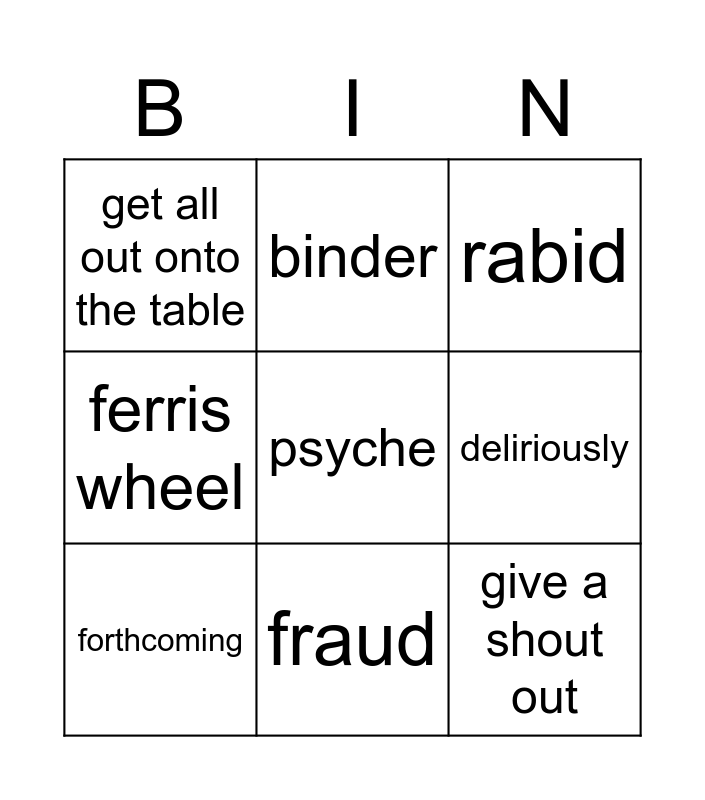 This bingo card has a free space and 11 words: bailor, fraud, give a shout out, forthcoming, binder, rabid, deliriously, reimburse something, ferris wheel, get all out onto the table and go hand in hand.