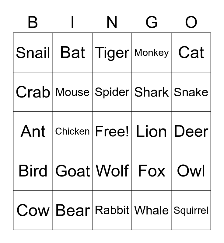 This bingo card has a free space and 33 words: Dog, Horse, Chicken, Pig, Bird, Mouse, Cat, Cow, Bat, Bug, Spider, Tiger, Sheep, Elephant, Lion, Snake, Bear, Ant, Goat, Fox, Wolf, Turtle, Snail, Deer, Rabbit, Squirrel, Monkey, Shark, Crab, Owl, Duck, Whale and Racoon.