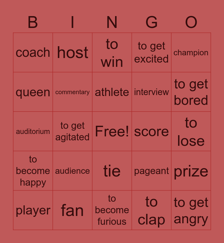 This bingo card has a free space and 24 words: audience, fan, athlete, player, champion, coach, queen, host, score, tie, interview, auditorium, pageant, prize, commentary, to clap, to lose, to win, to get bored, to get agitated, to get angry, to become happy, to get excited and to become furious.