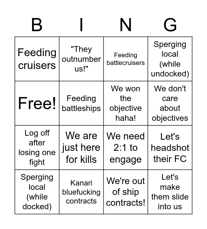 This bingo card has 16 words: Kanari bluefucking contracts, Let's headshot their FC, Feeding battlecruisers, Feeding cruisers, Log off after losing one fight, "They outnumber us!", We need 2:1 to engage, We're out of ship contracts!, Free!, Feeding battleships, Sperging local (while docked), Sperging local (while undocked), We are just here for kills, We don't care about objectives, We won the objective haha! and Let's make them slide into us.