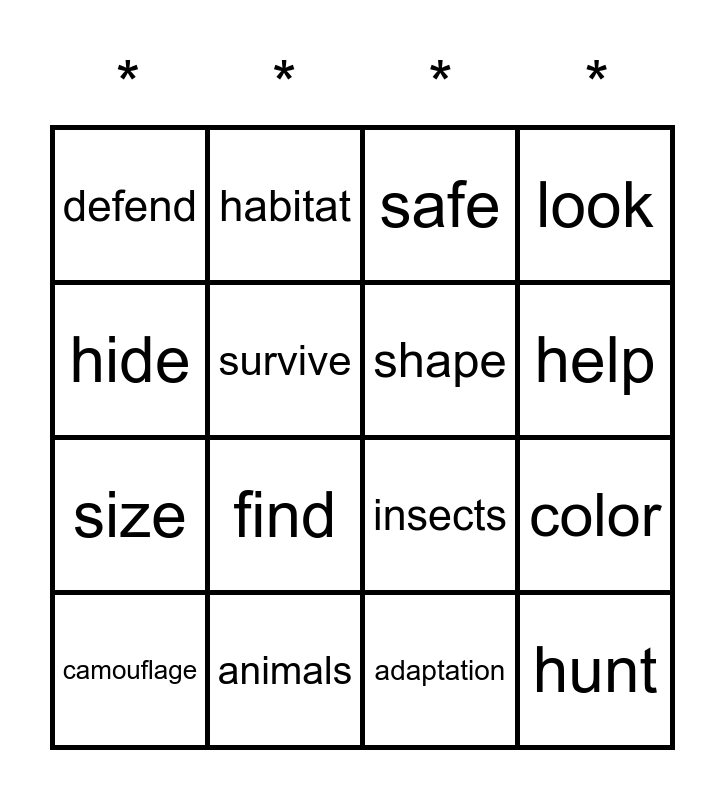 This bingo card has 16 words: animals, color, safe, defend, size, habitat, insects, adaptation, hide, survive, camouflage, look, find, help, shape and hunt.