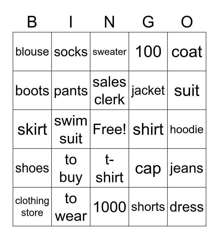 This bingo card has a free space and 24 words: to buy, to wear, sales clerk, clothing store, coat, blouse, boots, socks, shirt, t-shirt, jacket, skirt, cap, jeans, pants, shorts, hoodie, sweater, suit, swim suit, dress, shoes, 100 and 1000.