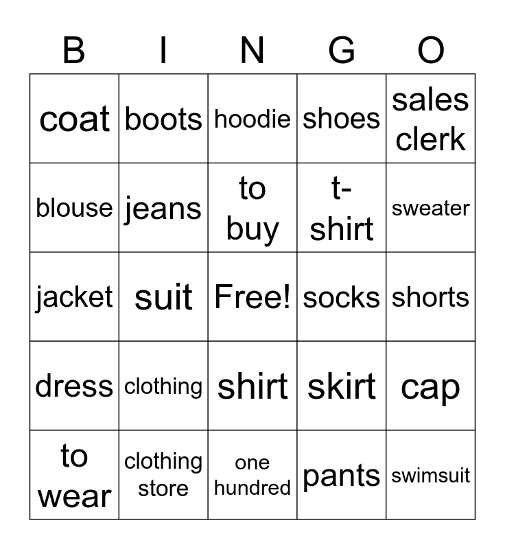 This bingo card has a free space and 24 words: clothing, clothing store, to buy, to wear, sales clerk, coat, blouse, boots, socks, shirt, t-shirt, jacket, skirt, cap, jeans, pants, shorts, hoodie, sweater, suit, swimsuit, dress, shoes and one hundred.