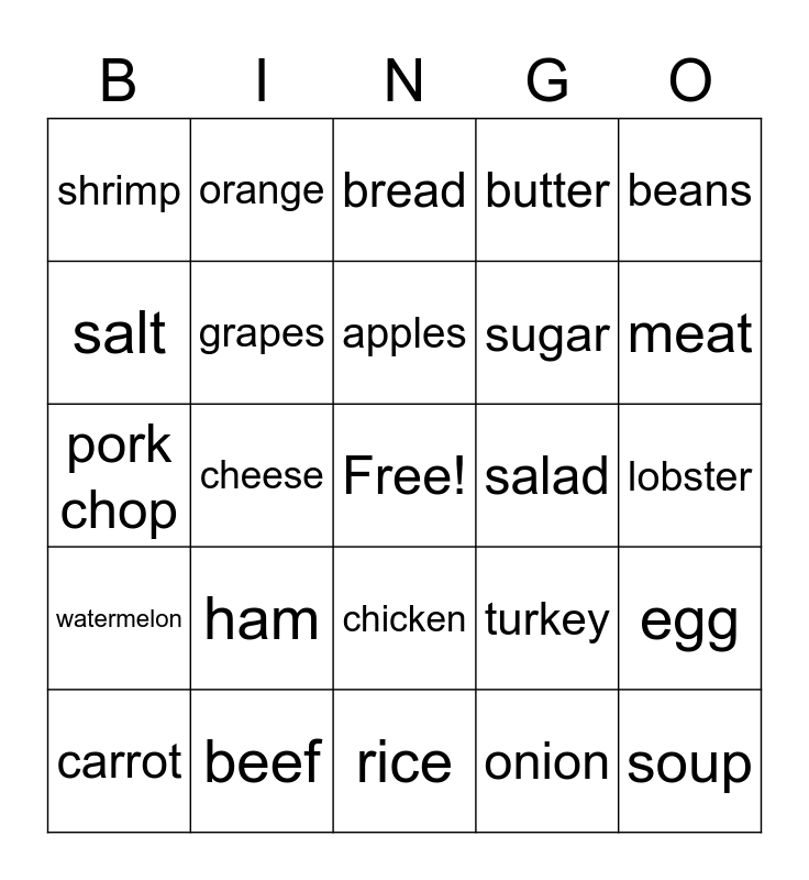 This bingo card has a free space and 34 words: strawberry, onion, mushroom, corn, watermelon, grapes, beans, carrot, orange, pear, apples, bread, cookie, fresh fires, salad, meat, beef, pork chop, ham, turkey, chicken, seafood, shrimp, lobster, rice, soup, butter, oil, sugar, salt, garlic, cheese, egg and ice cream.
