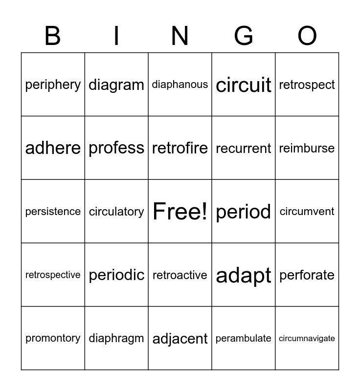This bingo card has a free space and 39 words: procrastinate, propensity, prologue, profess, promontory, retroactive, retrofire, retrogress, retrospect, retrospective, circulatory, circuit, circumnavigate, circumvent, period, periodic, perigee, periphery, periscope, adapt, adhere, adjacent, recurrent, reimburse, reiterate, secession, seclude, segregate, sequester, diagram, diagnose, diagnol, diaphanous, diaphragm, perambulate, percolate, perforate, persistence and pervasive.