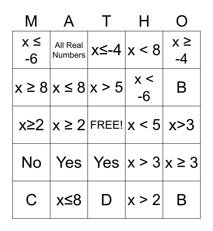 This bingo card has a free space and 48 words: A, B, C, D, Yes, No, All Real Numbers, No Solution, x ≥ 8, x > 8, x ≤ 8, x < 8, x ≥ 3, x > 3, x ≤ -3, x < -3, x > 5, x < 5, x ≤ -4, x ≥ -4, x ≥ 2, x > 2, x ≤ -6, x < -6, A, B, C, D, Yes, No, All Real Numbers, No Solution, x≥8, x>8, x≤8, x<8, x≥3, x>3, x≤-3, x<-3, x>5, x<5, x≤-4, x≥-4, x≥2, x>2, x≤-6 and x<-6.