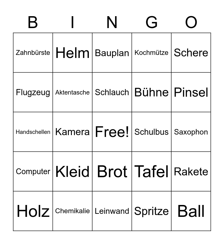 This bingo card has a free space and 24 words: Kleid, Chemikalie, Schlauch, Holz, Schere, Zahnbürste, Flugzeug, Helm, Schulbus, Brot, Bühne, Handschellen, Tafel, Rakete, Aktentasche, Spritze, Saxophon, Bauplan, Pinsel, Kamera, Ball, Computer, Kochmütze and Leinwand.