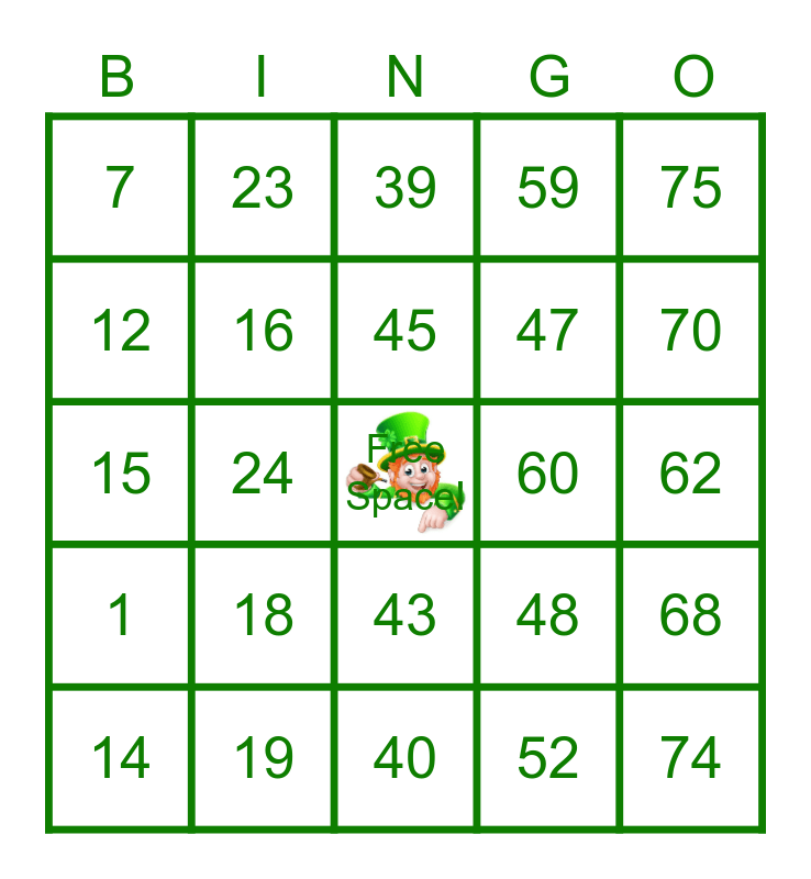 This bingo card has a free space and 24 words: 14, 18, 45, 52, 75, 7, 23, 39, 60, 62, 15, 16, 48, 68, 12, 19, 40, 59, 70, 1, 24, 43, 47 and 74.