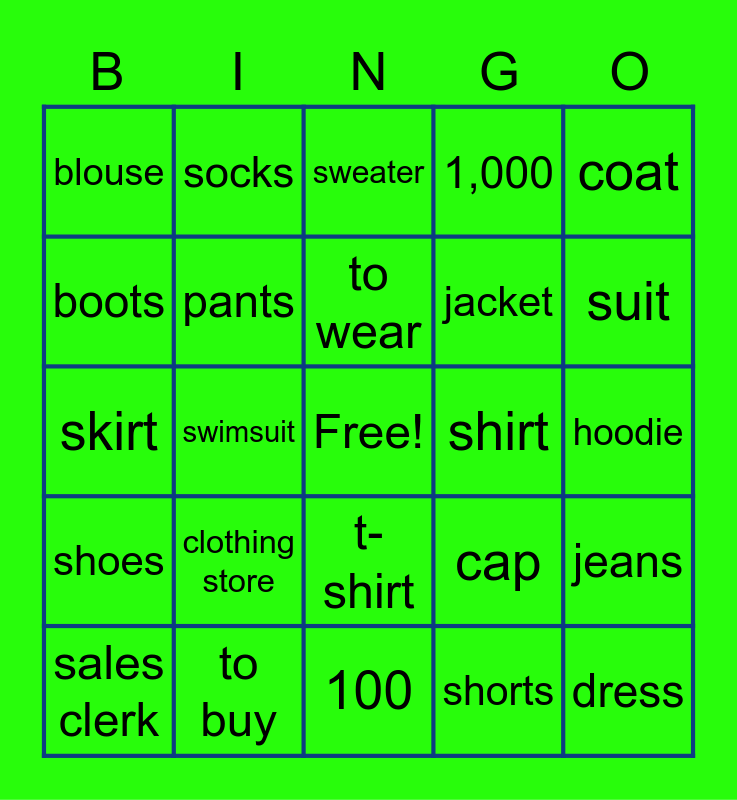 This bingo card has a free space and 24 words: clothing store, to buy, to wear, sales clerk, coat, blouse, boots, socks, shirt, t-shirt, jacket, skirt, cap, jeans, pants, shorts, hoodie, sweater, suit, swimsuit, dress, shoes, 1,000 and 100.