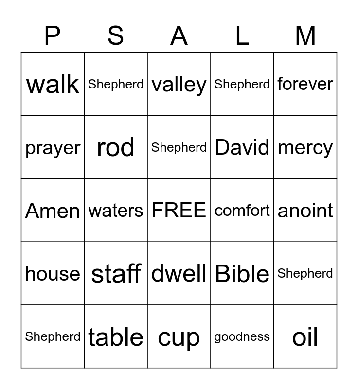 This bingo card has a free space and 29 words: Shepherd, green, waters, Lord, walk, valley, rod, staff, comfort, table, anoint, oil, cup, goodness, mercy, life, dwell, house, forever, Amen, Bible, Psalm, David, prayer, Shepherd, Shepherd, Shepherd, Shepherd and Shepherd.