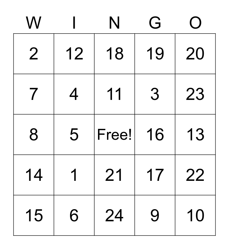 This bingo card has a free space and 24 words: 1, 6, 11, 15, 20, 2, 7, 12, 16, 21, 3, 8, 17, 22, 4, 9, 13, 18, 23, 5, 10, 14, 19 and 24.