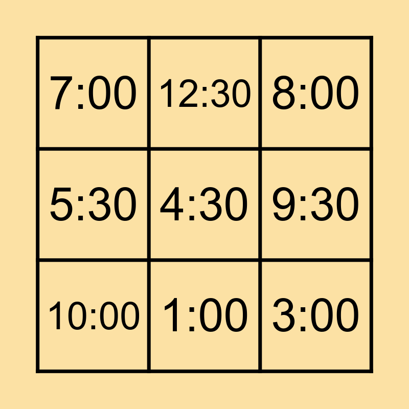 This bingo card has 9 words: 10:00, 8:00, 12:30, 5:30, 7:00, 9:30, 4:30, 3:00 and 1:00.